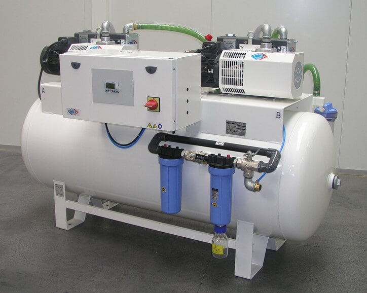 З пластинчасто-роторним або водокільцевим вакуумним насосом. Насоси встановлюються групами по 2, 3 і більше одиниць, поперемінно використовуються як основне та резервне обладнання.