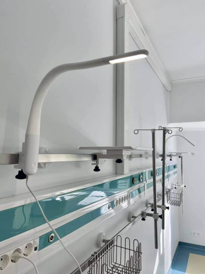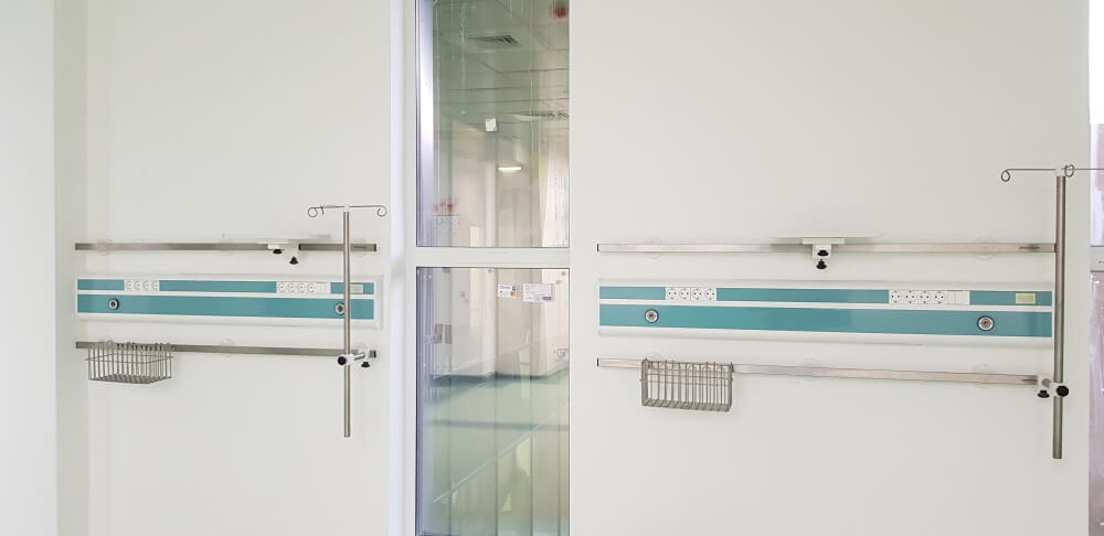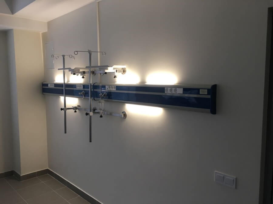 Настінні консолі використовуються для встановлення в палатах пацієнта для подачі медичних газів та електрики. За бажанням Замовника, вони можуть бути укомплектовані світильниками для верхнього або нічного освітлення. Дизайн консолі – індивідуальний, залежить від побажань Замовника до систем розподілу газів та точок виведення електричних компонентів та газу/газових сумішей, а також дизайну медичних палат.